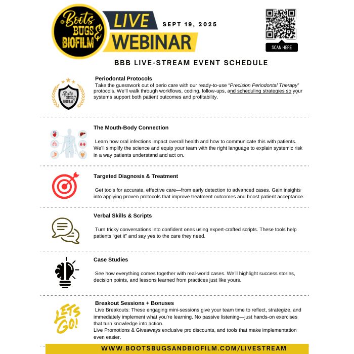 Can’t make it to Nashville? No worries! This LIVE-streamed version brings the same energy, insight, and impact straight to you—no travel required! Created for the entire dental team—dentists, hygienists, and support staff—ready to break free from conventional care. Discover how to implement Precision Periodontal Therapy protocols that streamline your systems and elevate patient outcomes.
